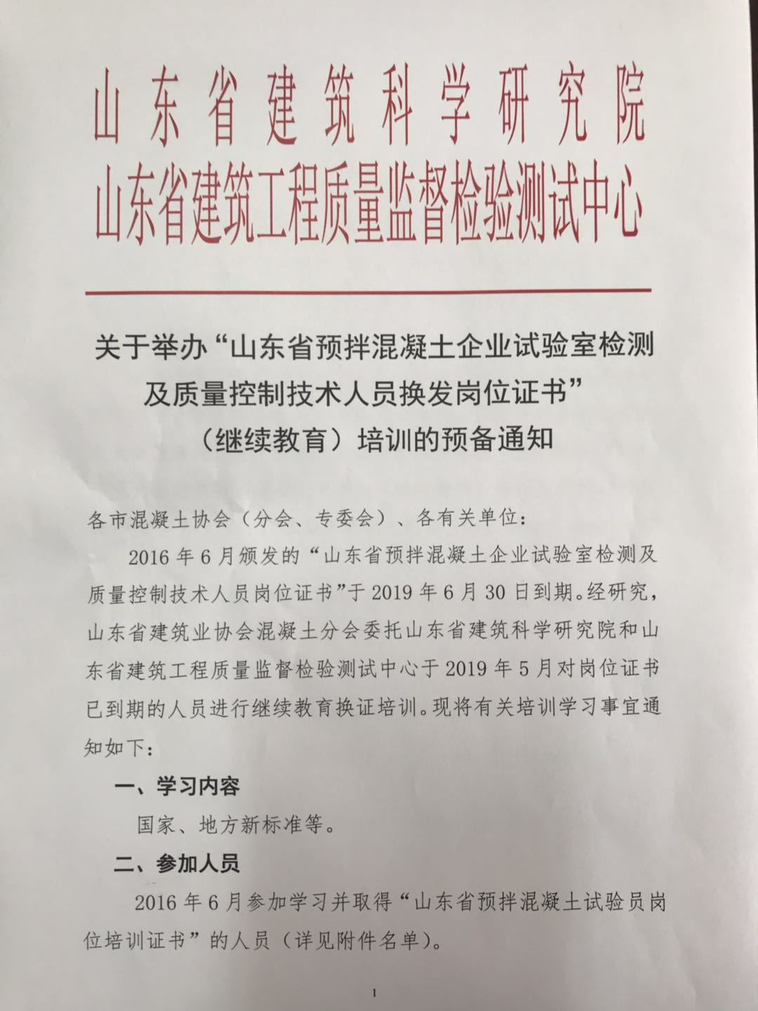 關(guān)于舉辦“山東省預(yù)拌混凝土企業(yè)試驗(yàn)室檢測(cè)及 質(zhì)量控制技術(shù)人員換發(fā)崗位證書” (繼續(xù)教育)培訓(xùn)的預(yù)備通知