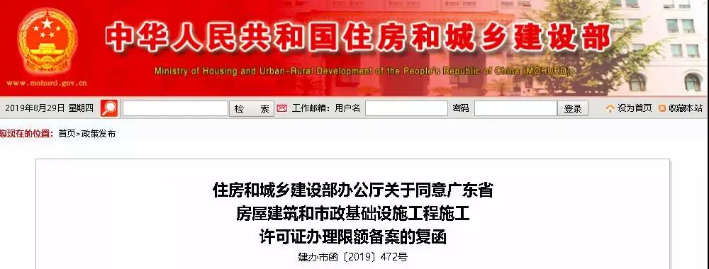2019年8月16日,住房和城鄉(xiāng)建設部辦公廳復函廣東省住建廳,同意其《關于申請廣東省房屋建筑和市政基礎設施工程施工許可證辦理限額備案的請示》,并予以備案。