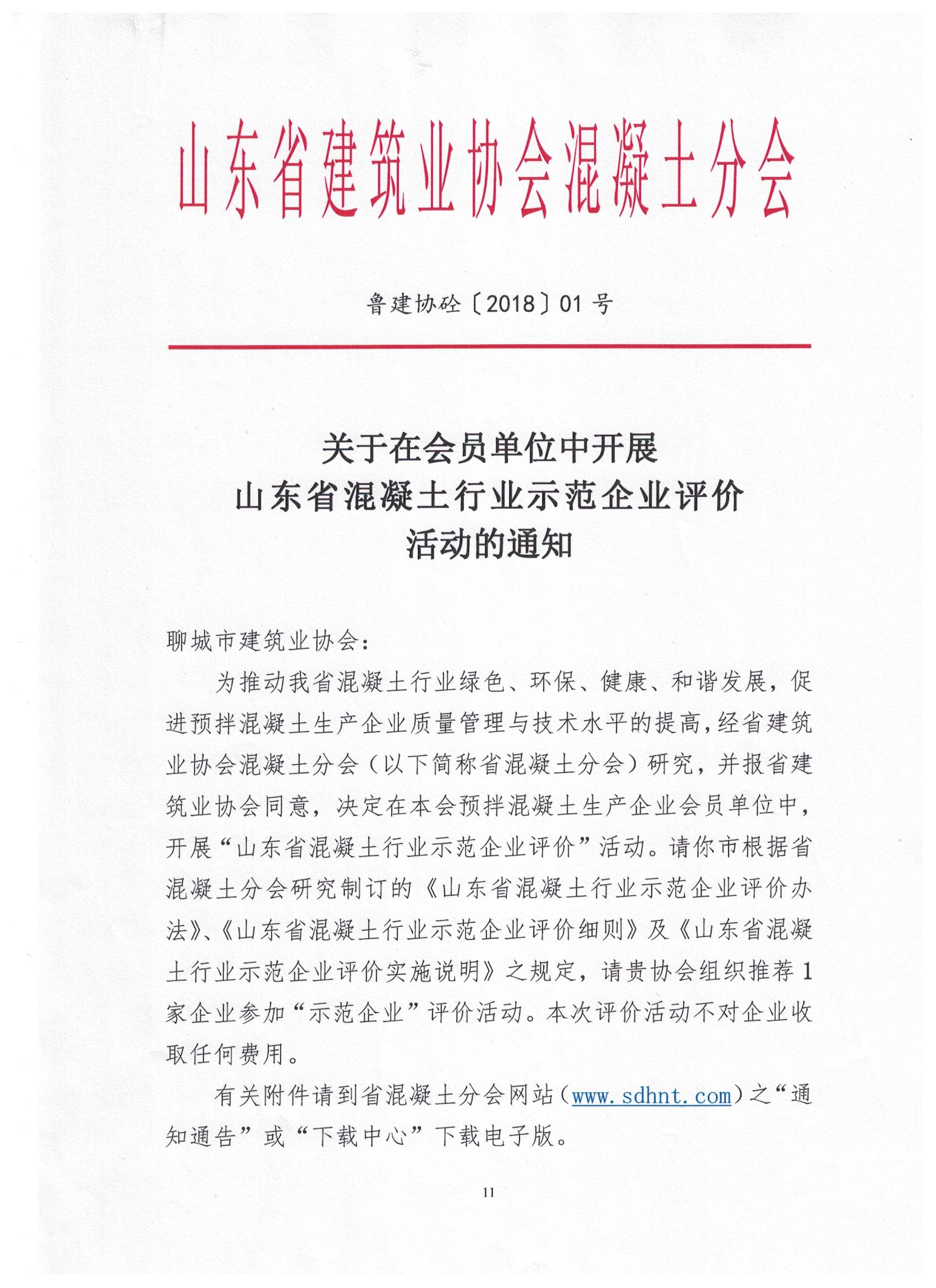 各會(huì)員單位: 山東省建筑業(yè)系會(huì)混凝土分會(huì)正在開展“山東省混凝土行業(yè)示范企業(yè)評(píng)價(jià)”活動(dòng),聊建協(xié)將推薦我市企業(yè)參加“示范企業(yè)”評(píng)選。這將對(duì)我市預(yù)拌混凝土生產(chǎn)企業(yè)質(zhì)量管理和技術(shù)水平的提高起到極大的促進(jìn)作用,且獲得“示范企業(yè)”的單位,將具備推薦參評(píng)“中國(guó)混凝土行業(yè)優(yōu)秀企業(yè)”的基本條件。現(xiàn)將具體參選條件和其他事項(xiàng)公布如下,望達(dá)到標(biāo)準(zhǔn)的企業(yè)積極申報(bào),擇優(yōu)推薦。 一、我市建筑業(yè)協(xié)會(huì)會(huì)員; 二、企業(yè)須為省混凝土分會(huì)3A級(jí)以上的“信用企業(yè)”; 三、通過GB/T19001-2008(ISO9001-2008)質(zhì)量體系認(rèn)證,評(píng)價(jià)單位與認(rèn)證單位名稱一致,證書在有效期內(nèi)。 四、申報(bào)企業(yè)必須對(duì)申報(bào)材料的真實(shí)、有效性負(fù)責(zé)。凡因提供虛假材料、證明或證書而騙取“示范企業(yè)”榮譽(yù)的,一經(jīng)查實(shí),省混凝土分會(huì)將對(duì)其通報(bào)批評(píng),并取消參加下屆評(píng)價(jià)資格。同時(shí),由市建協(xié)負(fù)責(zé)將其“示范企業(yè)”證書、牌匾收回,取消其稱號(hào)。